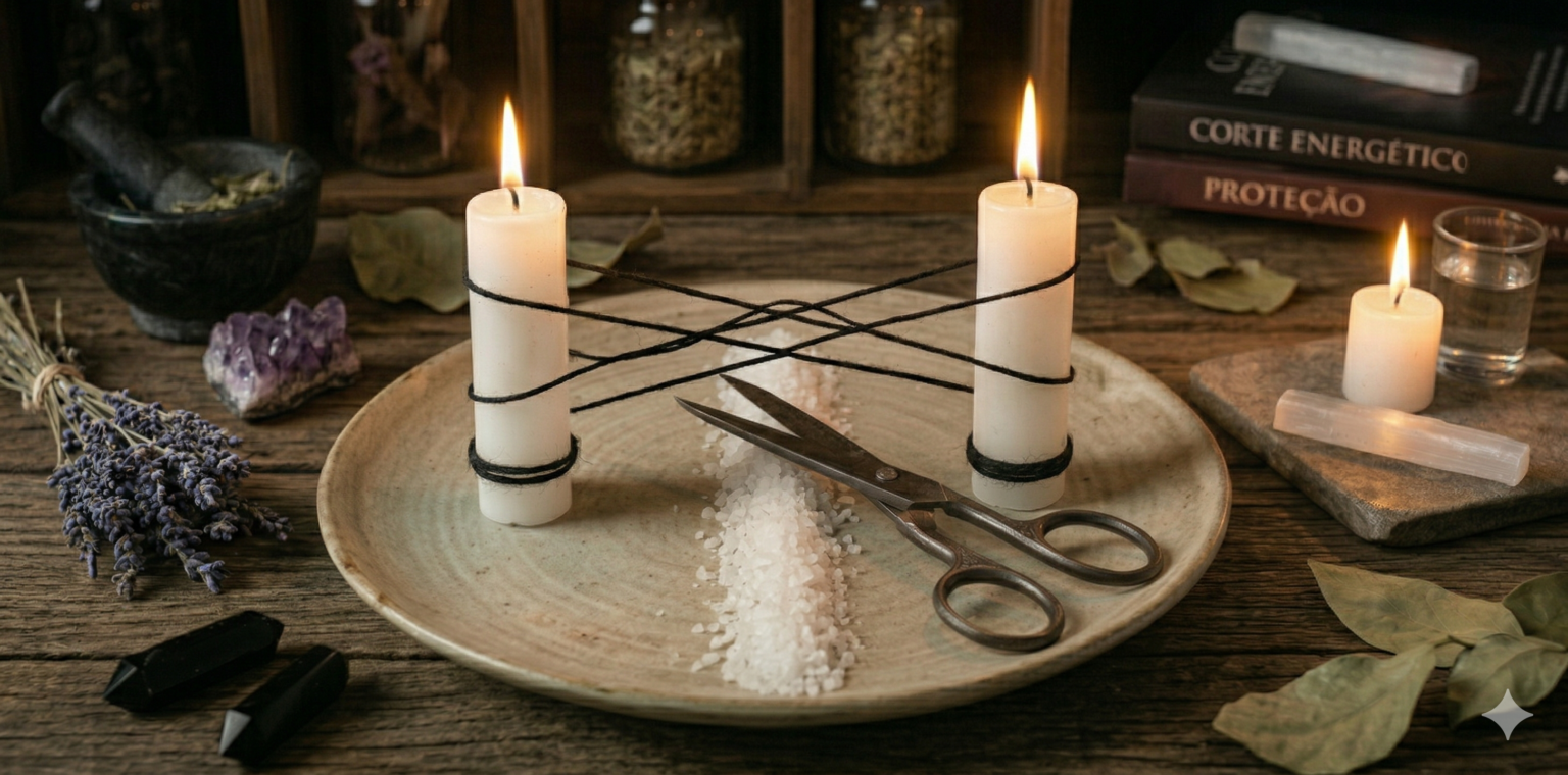 Deixe as velas queimarem até o fim. Quando a linha for atingida pelo fogo, o corte simbólico acontece. Os restos de cera e o sal podem ser descartados no lixo (fora de casa) ou em água corrente. A tesoura pode ser lavada e guardada para outros rituais.