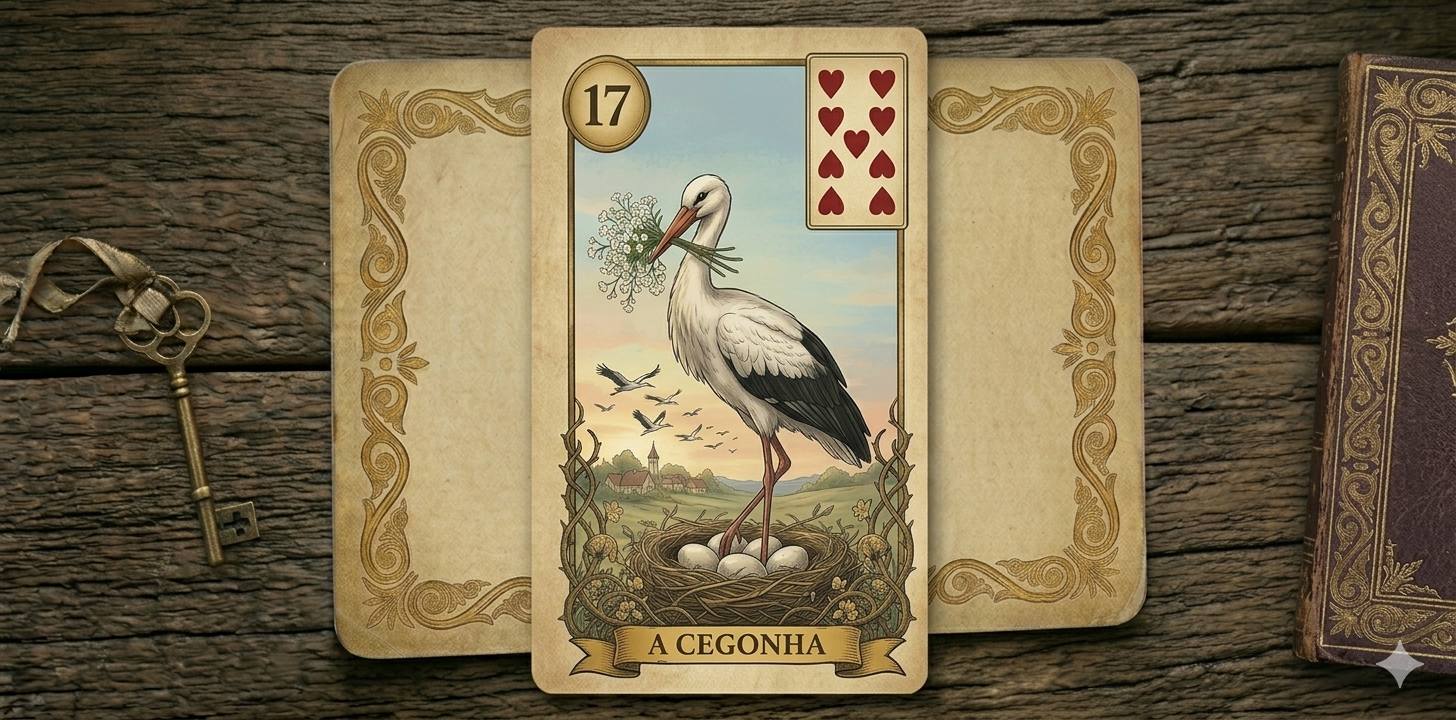 Chegamos à Carta 17 (A Cegonha). Esta é a lâmina do movimento e da renovação. Enquanto o Cachorro (18) fala do que permanece, a Cegonha anuncia que algo está prestes a mudar. No sistema Lenormand, ela é o sinal de que o ar fresco está entrando na sua vida.
