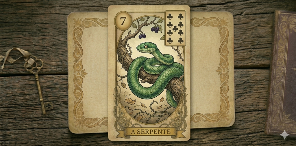 A Carta 7 do Baralho Cigano é A Serpente (ou A Cobra). No sistema Petit Lenormand, ela é uma das lâminas mais complexas e desafiadoras. É uma carta de polaridade negativa que exige extrema cautela, pois lida com energias de traição, desvio e astúcia.