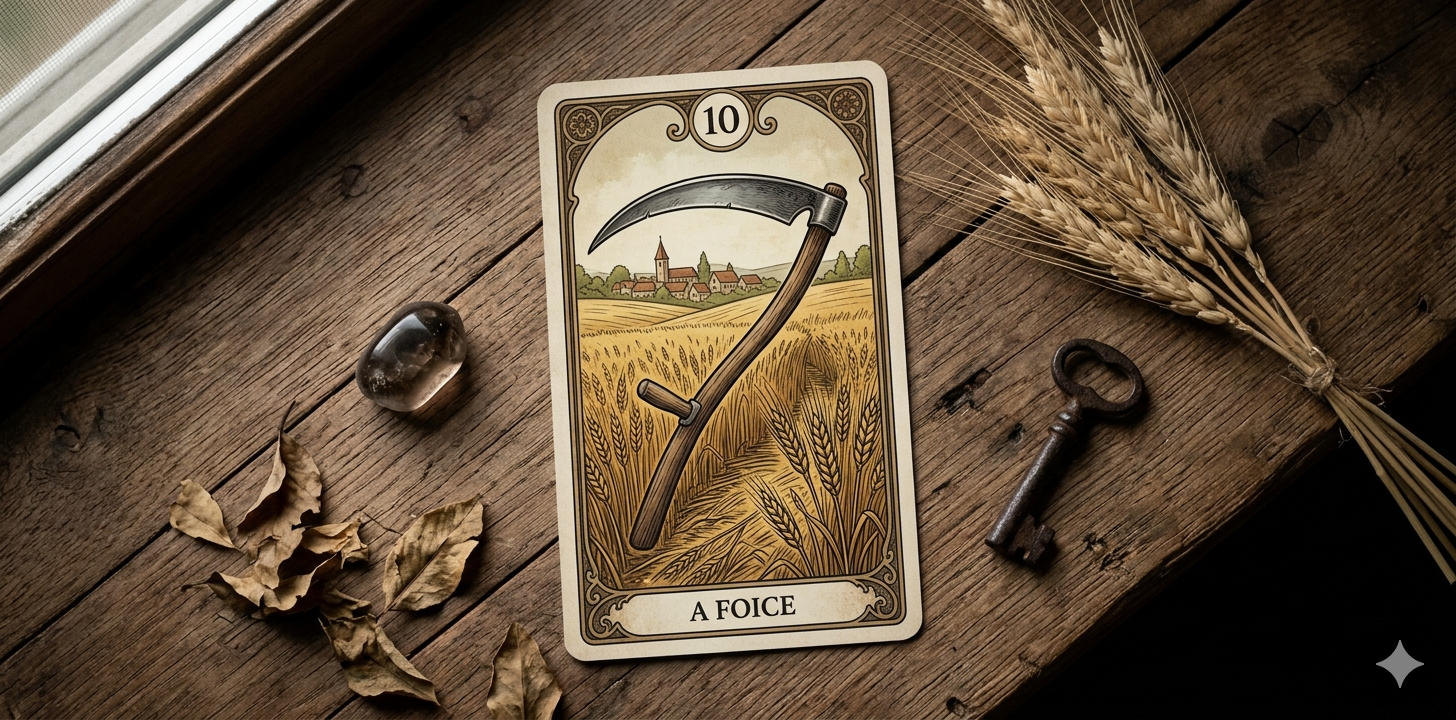 Chegamos à Carta 10 (A Foice). No Baralho Cigano, esta é a lâmina da colheita e do corte. Na cartomancia preditiva, ela é temida por muitos, mas seu papel é vital: ela encerra o que não tem mais vida para que a terra possa ser preparada para o novo.