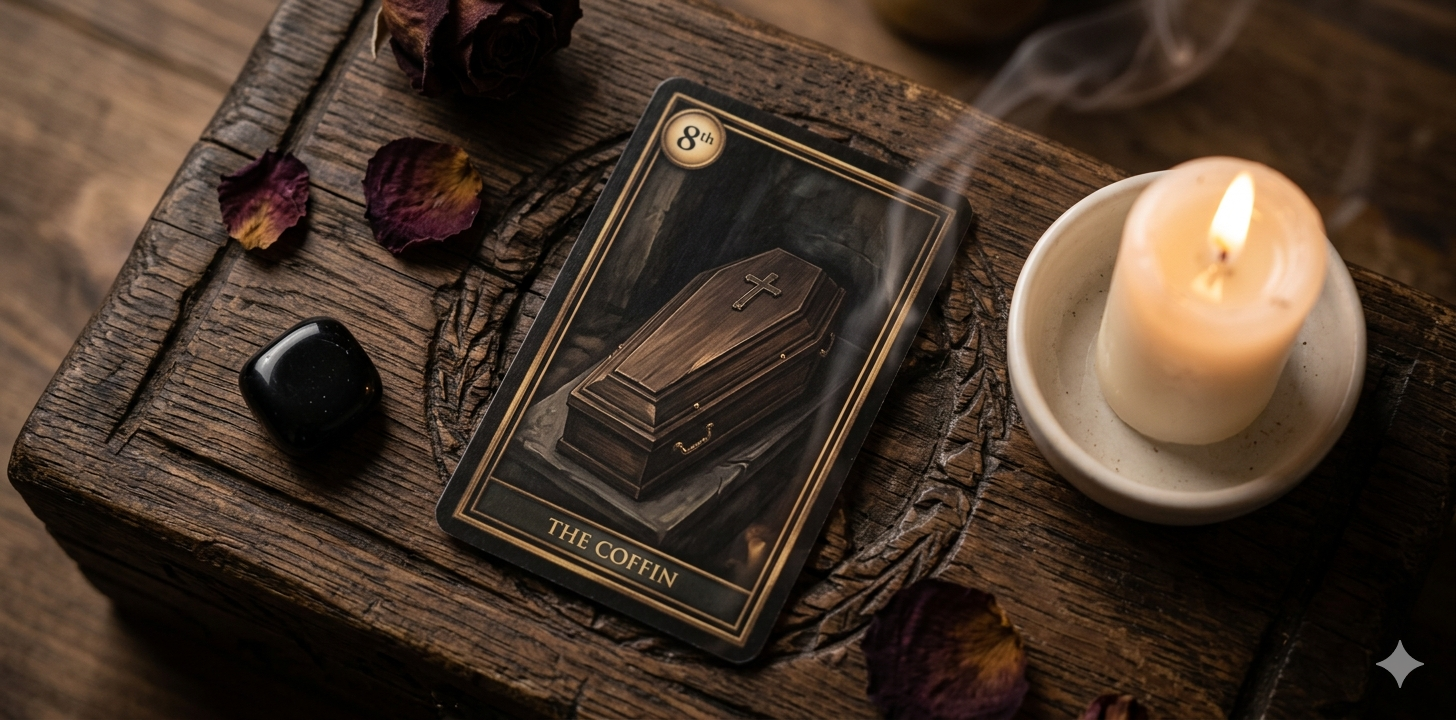 Chegamos à Carta 8 (O Caixão). Se a Foice (10) é o corte brusco, o Caixão é o processo de encerramento. Na cartomancia preditiva, esta é uma das cartas mais profundas e, muitas vezes, mal compreendida. No sistema Lenormand, ela não fala de morte física, mas de uma transformação radical onde algo precisa morrer para que o novo nasça.