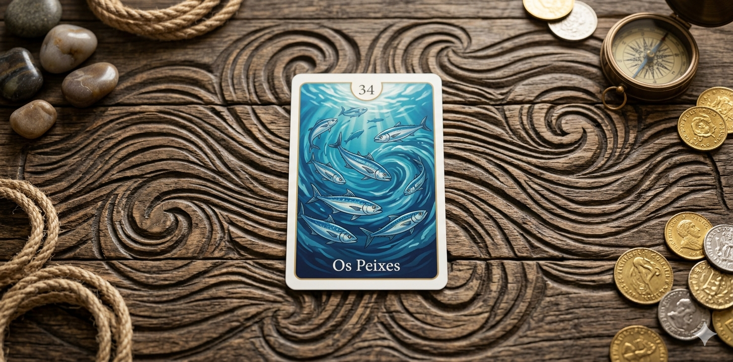 Chegamos à Carta 34 (Os Peixes). No sistema de adivinhação Lenormand, esta é a carta mestre da prosperidade e do fluxo material. Se a Chave (33) abriu a porta, os Peixes trazem o que há de valor lá dentro. Ela representa o movimento constante do dinheiro, dos negócios e da abundância.