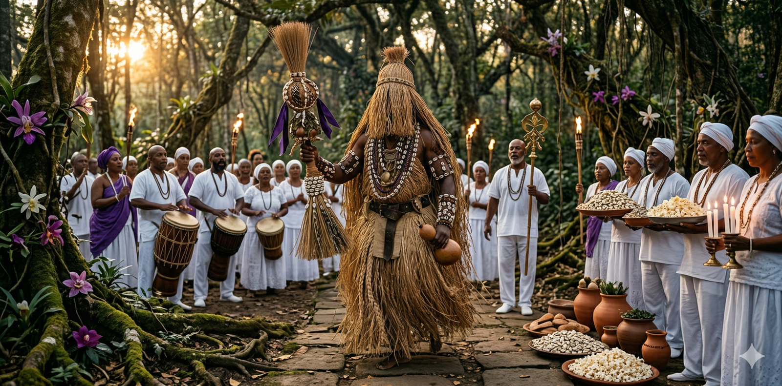 - Símbolo: O Xaxará (um feixe de palha decorado com búzios usado para varrer as doenças e energias negativas).