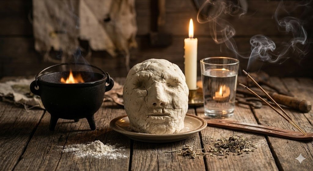 3. O Controle Mental (O Comando): Olhe fixamente nos olhos da cabeça de farinha. Visualize a imagem da pessoa flutuando à sua frente, sendo atraída para dentro daquela massa. Firme sua voz e declare: